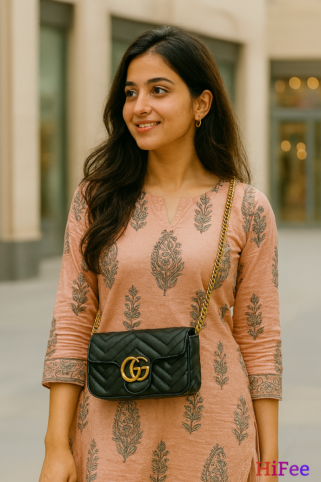 Its compact silhouette is perfect for carrying your essentials in style — whether you're heading to work, a coffee date, or an evening out. The gold-tone chain strap adds a sophisticated edge, while the flap closure ensures security and ease of access. Pair it with formal, casual, or festive wear — it complements every look with effortless charm.